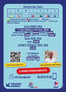 *Location du matériel (armure) jusqu’à l'acquisition de la vôtre. Pour la pratique du kendo, il est recommandé de porter un Kendogi et un Hakama. Lors des premiers cours un jogging sombre et un T-Shirt blanc sans publicité peuvent convenir.