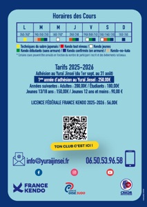 *Location du matériel (armure, shinai et bokken) jusqu’à l'acquisition du vôtre. Pour la pratique du kendo, il est recommandé de porter un Kendogi et un Hakama. Lors des premiers cours un jogging sombre et un T-Shirt blanc sans publicité peuvent convenir.