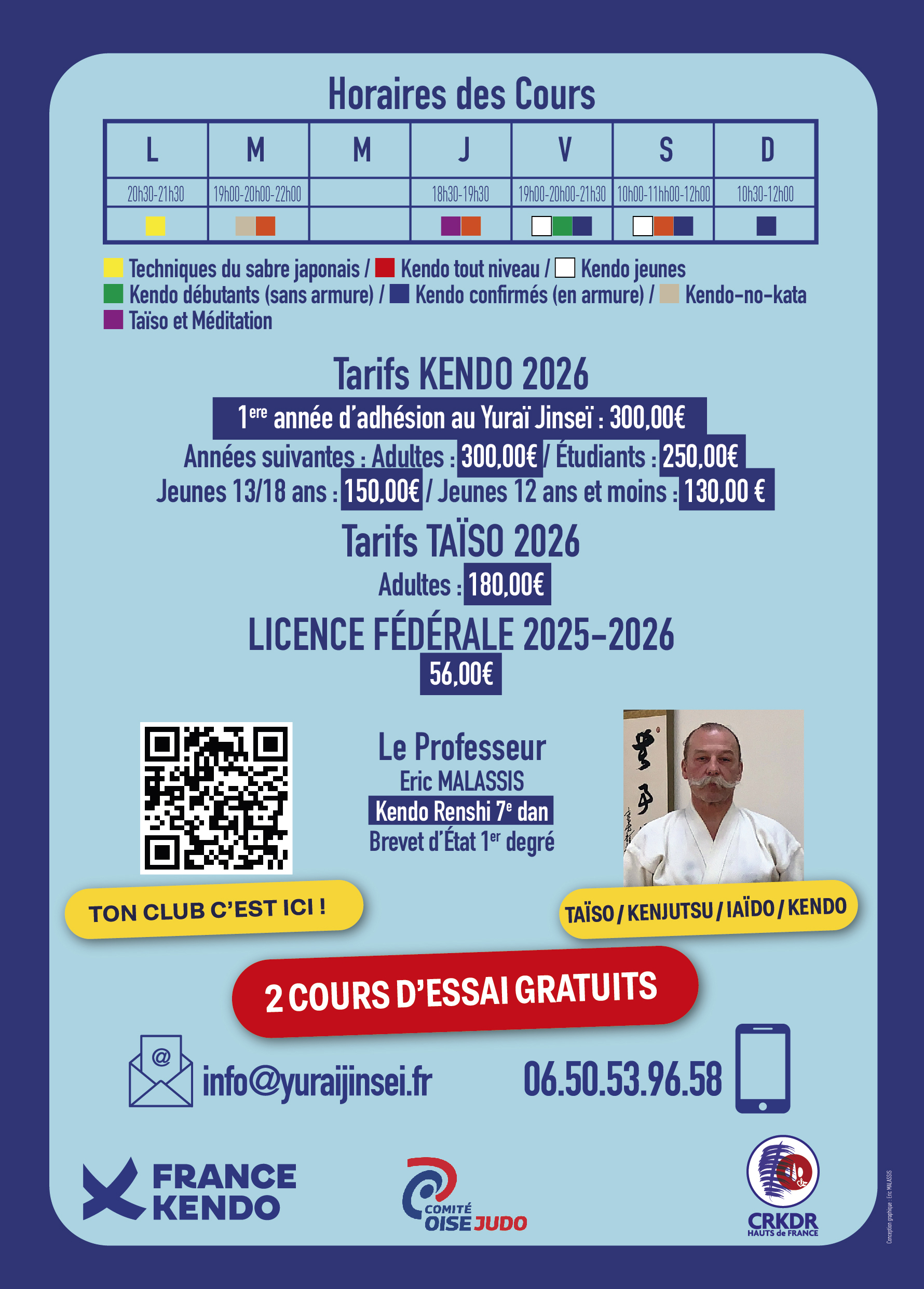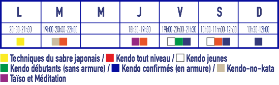 *Location du matériel (armure) jusqu’à l'acquisition de la vôtre. Pour la pratique du kendo, il est recommandé de porter un Kendogi et un Hakama. Lors des premiers cours un jogging sombre et un T-Shirt blanc sans publicité peuvent convenir.